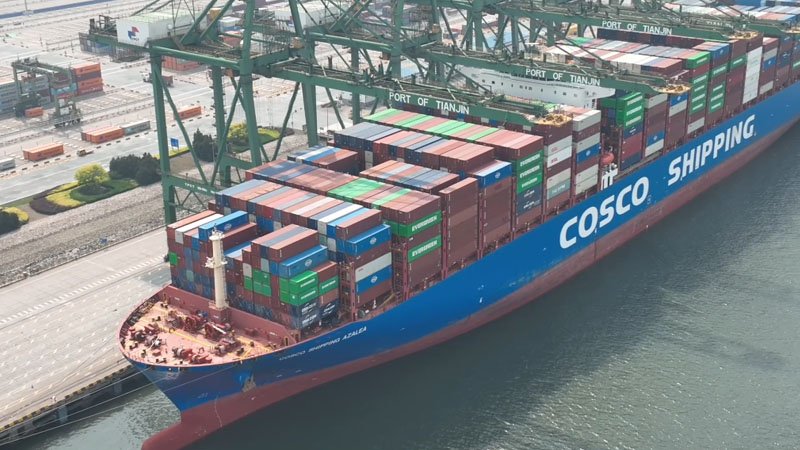 近日,在拖轮助力下,载着上万个集装箱的“中远海运杜鹃”轮缓缓驶进天津港。
