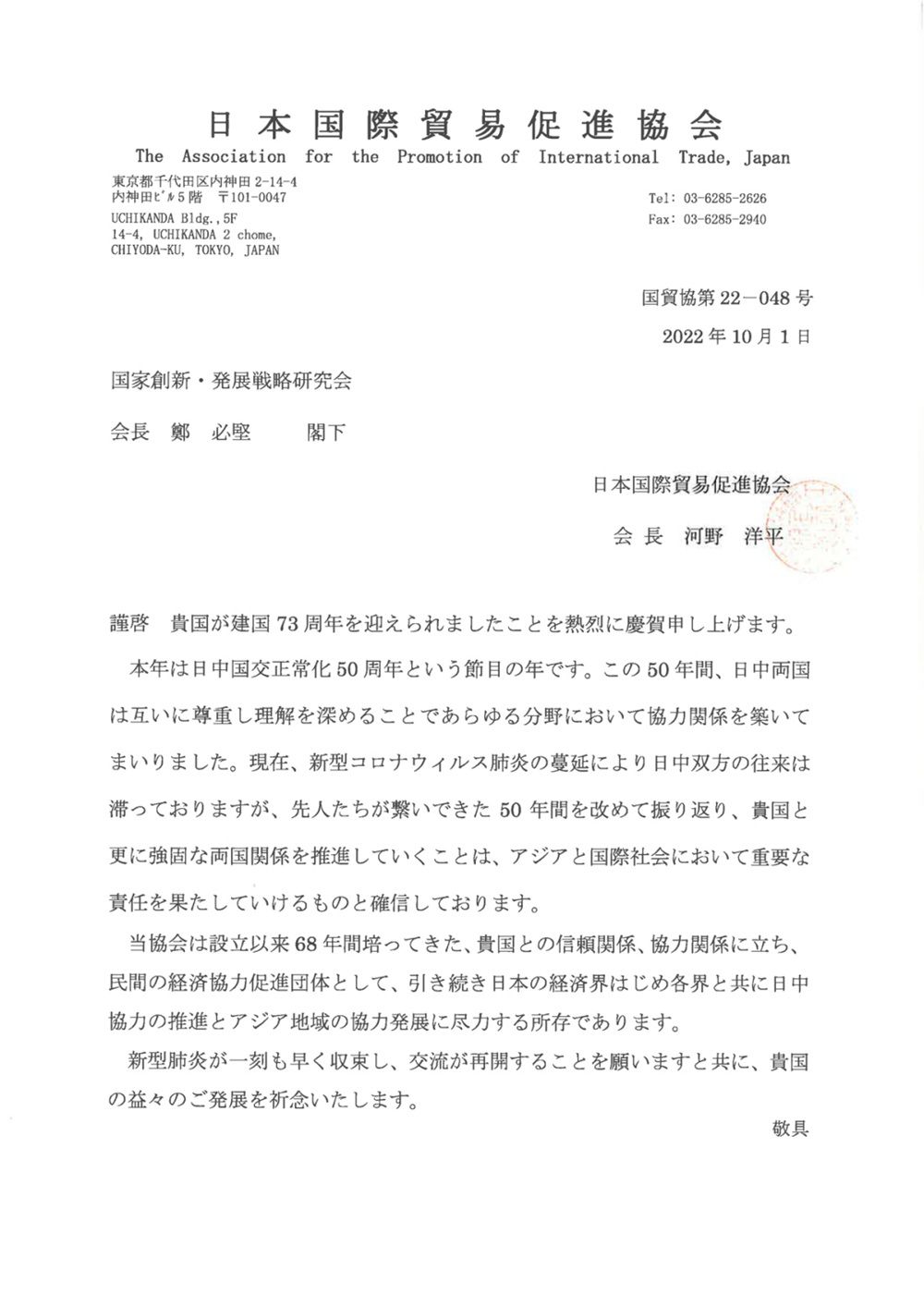 2022年10月1日,在中华人民共和国成立73周年之际,日本国际贸易促进协会会长、前众议院议长河野洋平致信我会郑必坚会长,向中国及中国人民致以国庆祝福。