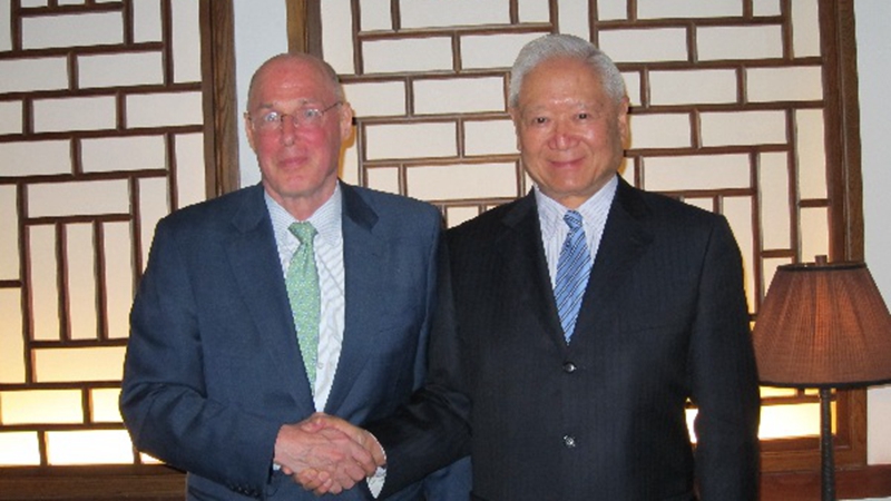 2011年4月12日,郑必坚会长会见了即将离任的美国驻华大使洪博培(Jon Huntsman)。双方就“共同利益”和“共同价值观”进行了讨论。