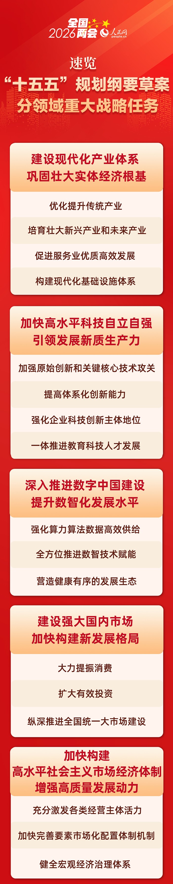 根据《中共中央关于制定国民经济和社会发展第十五个五年规划的建议》,国务院编制了《中华人民共和国国民经济和社会发展第十五个五年规划纲要(草案)》(以下简称“十五五”规划纲要草案)。“十五五”规划纲要草案阐述了哪些重大战略任务?人民网带您速览。